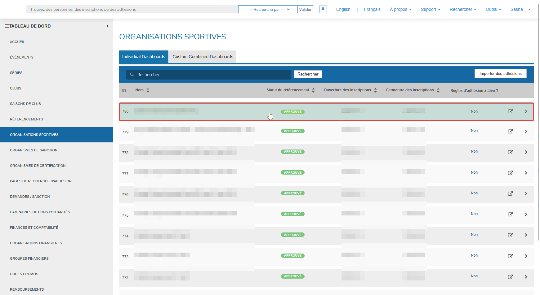 Dans le tableau de bord, sélectionnez la catégorie appropriée (Organisations d'affiliation ou Organisations de sanction ou Organisations de certification).